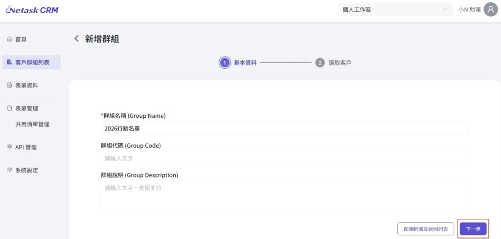 b. 或點選「下一步」,於選取客戶下拉選擇預設公海,或其他群組具完整權限客戶名單,選取客戶後可將其移入此新建群組中。