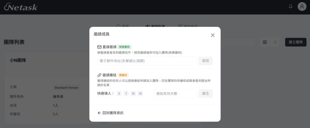 快速填入點選連結有效天數(3、7、10、15天),按下產生即可產出邀請連結,將邀請連結網址傳送給欲邀請的成員,在有效時間內點選申請加入,經擁有者審核後方可加入該團隊。