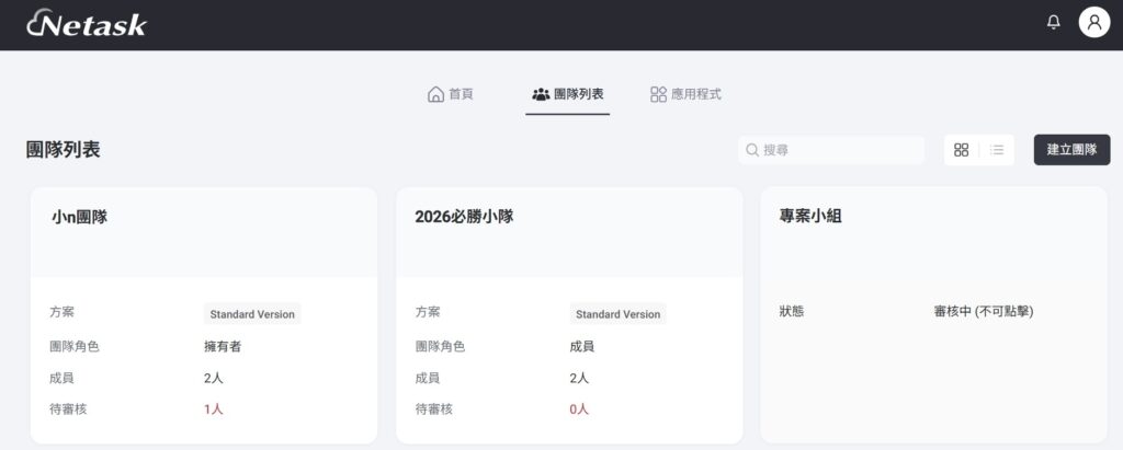 顯示目前使用者已加入或等待加入(審核中)團隊的相關資訊,審核中的團隊不能點入檢視相關資訊。